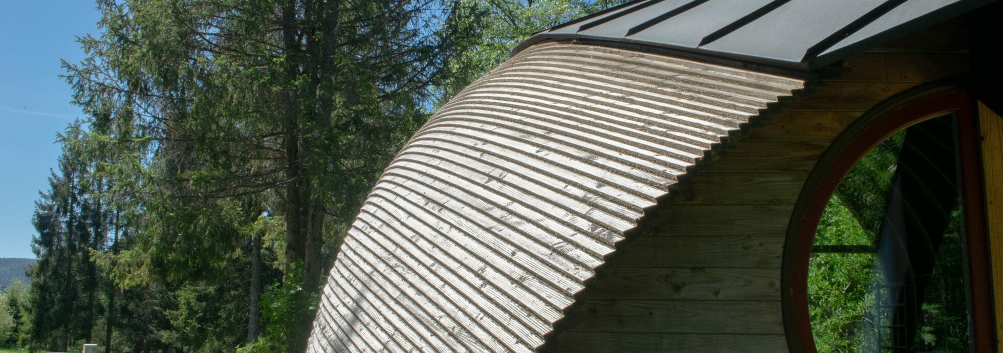 Hülle:Holzkonstruktion mit Wärmedämmung und einer Douglasien Beplankung. Eingangsbereich komplett verglast.